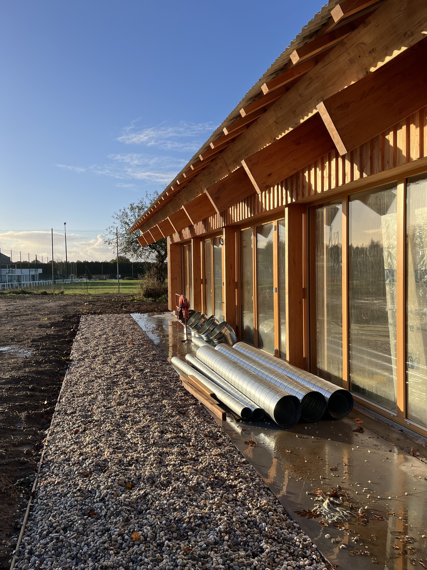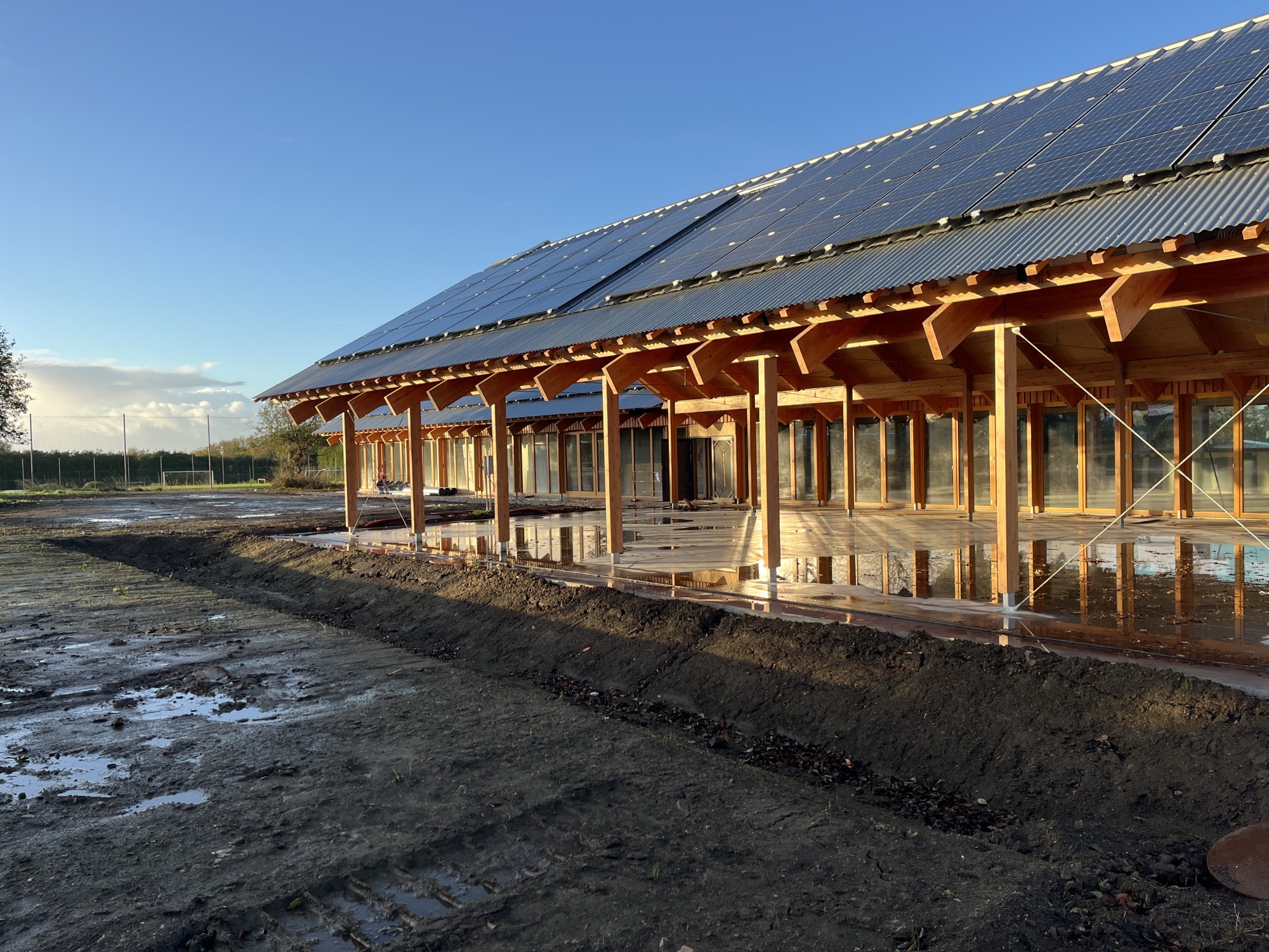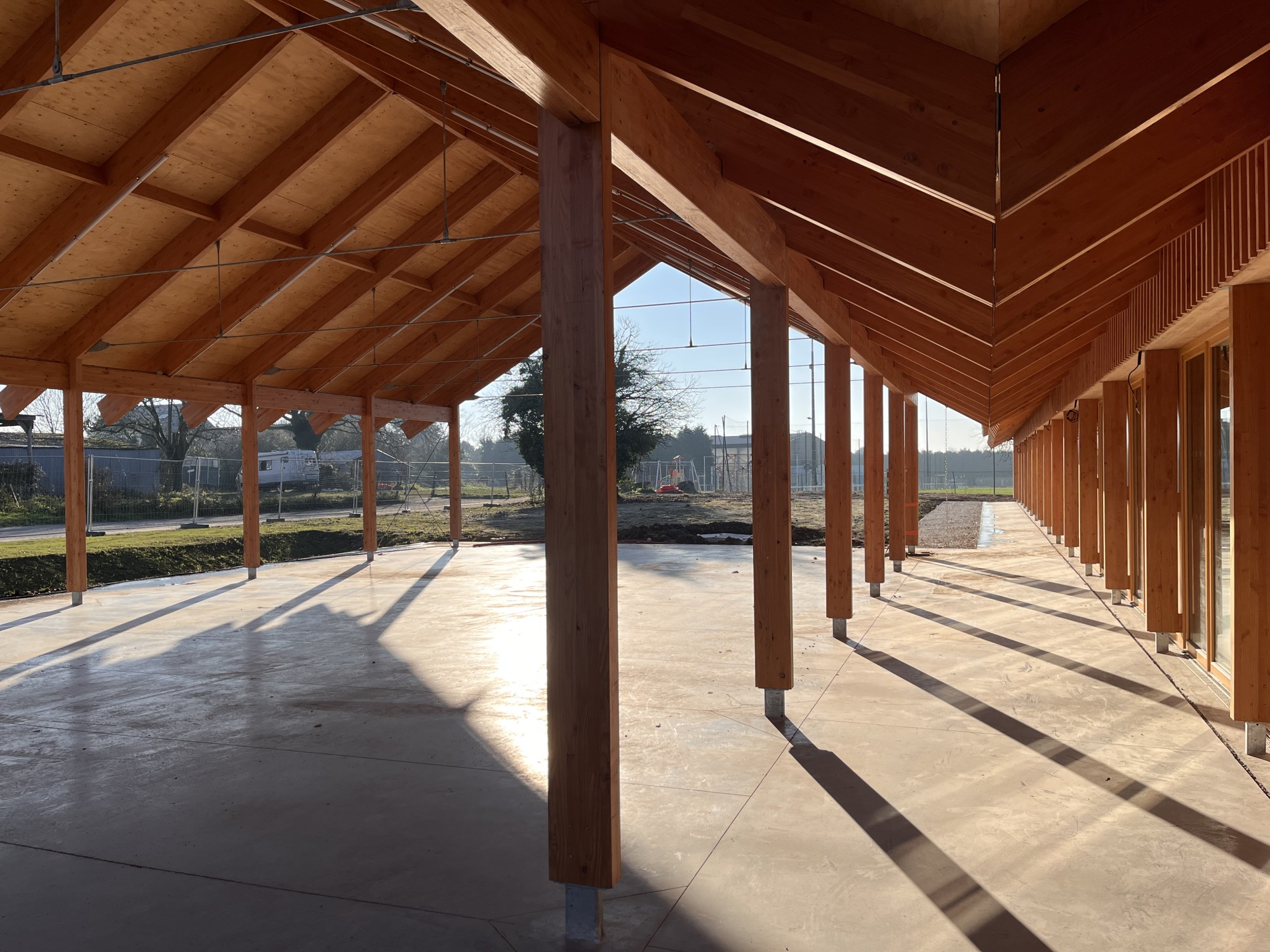 La nouvel équipement, construit en ossature bois et isolation paille, est coiffée d’une couverture en bac acier ondulé recouverte de panneaux photovoltaïques sur les pans Ouest. Sa façade Est, entièrement vitrée, s’ouvre complètement sur la halle couverte par le biais de portes accordéons en bois. Ce dispositif permet ainsi de doubler la surface de la salle principale lors des manifestations estivales.-