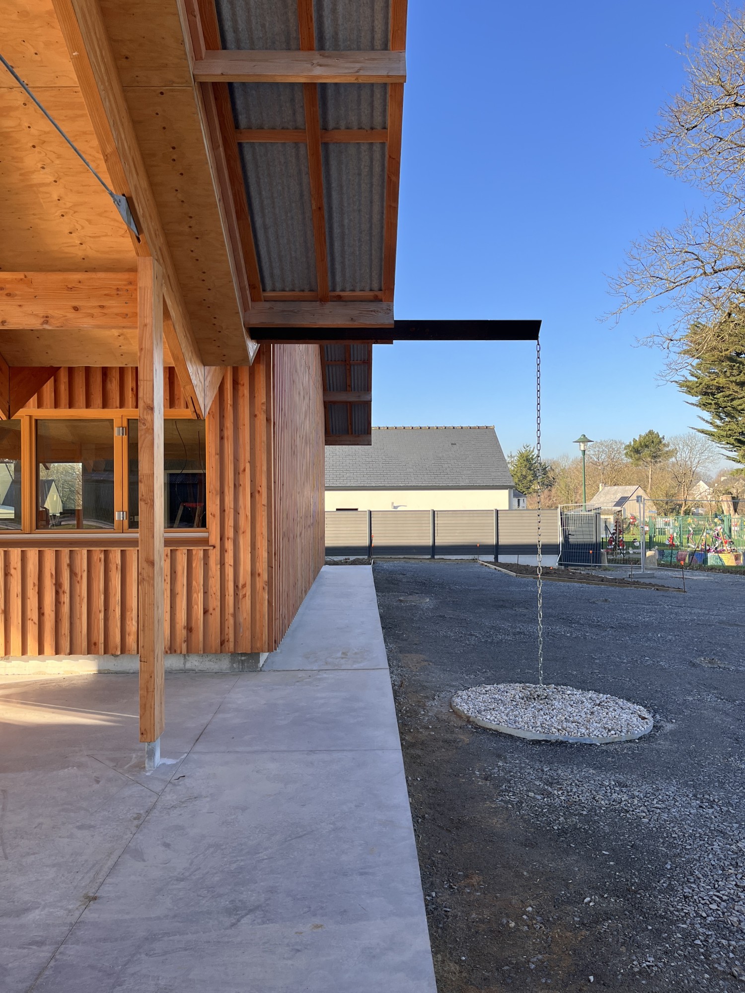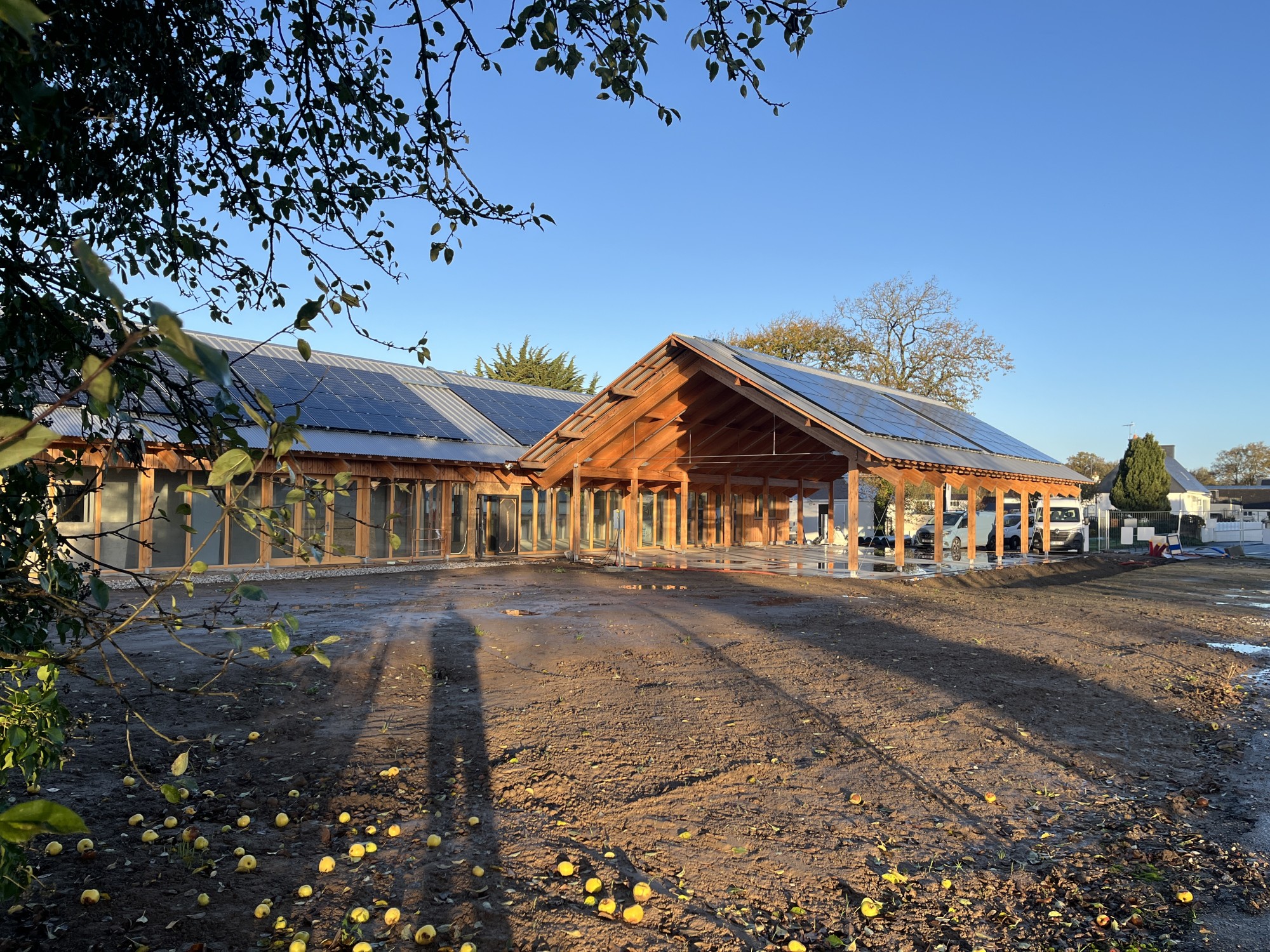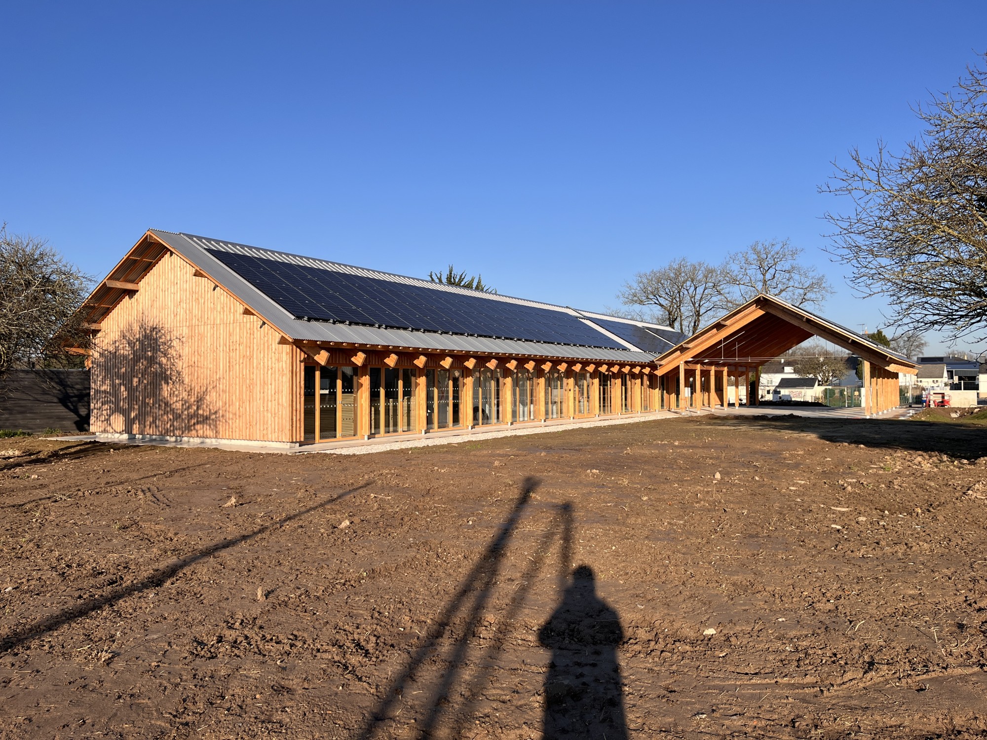 Ce bâtiment présente la forme d’une longère traversante Est-Ouest, prolongée en L par la halle. Cette figure permet de qualifier deux espaces : une placette au Nord en lien avec l’école, le nouvel équipement, les cheminements existants, et un jardin au Sud où les arbres fruitiers existants sont conservés. La halle couverte, en structure bois et charpente bois apparente, initie la transition entre ces deux entités.