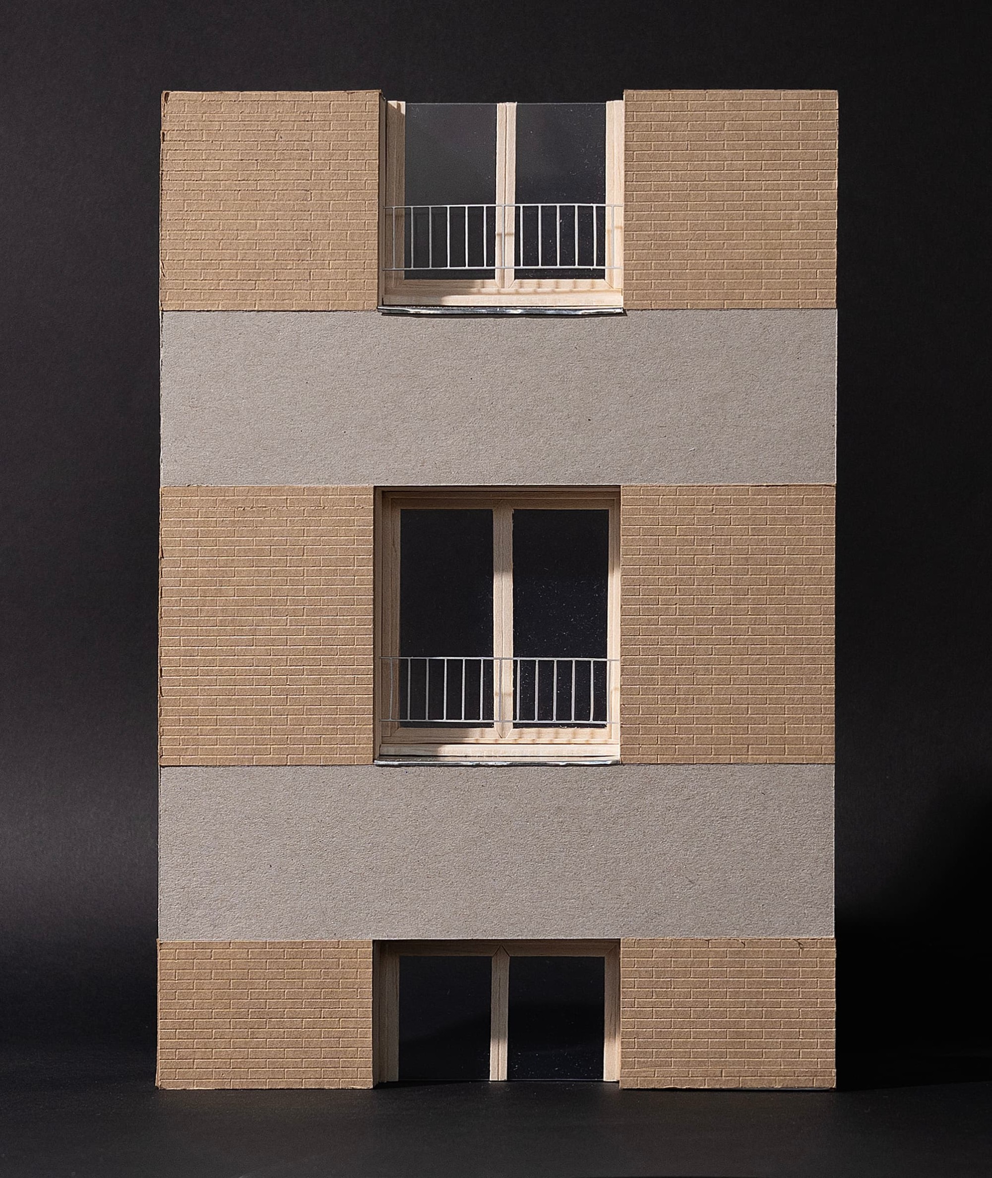 Le socle commercial est réalisé en béton blanc, ton sable. Chaque plot de logements est construit avec ce même béton et déploie des horizontales revêtues de brique émaillée sur la hauteur des menuiseries. L’utilisation de la brique, tout comme le vocabulaire horizontal vient rappeler l’écriture architecturale de l’école Jean Jaurès à l’Ouest quand le béton fait écho à la Maison du Théâtre et de la Danse située au Nord, de l’autre côté de l’espace central.-