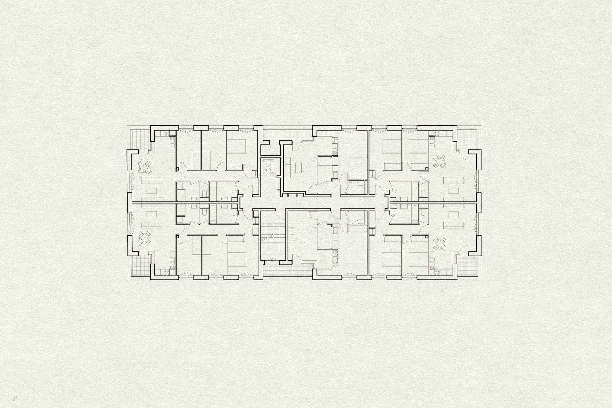 Les halls des logements sont traversants, accessibles aussi bien par le parvis commercial au Nord que par le jardin en cœur d’ilot au Sud. Plus qu’un simple lieu de passage, ces liaisons autorisent un fonctionnement transversal de la parcelle qui favorise l’usage du jardin en cœur d’ilot.