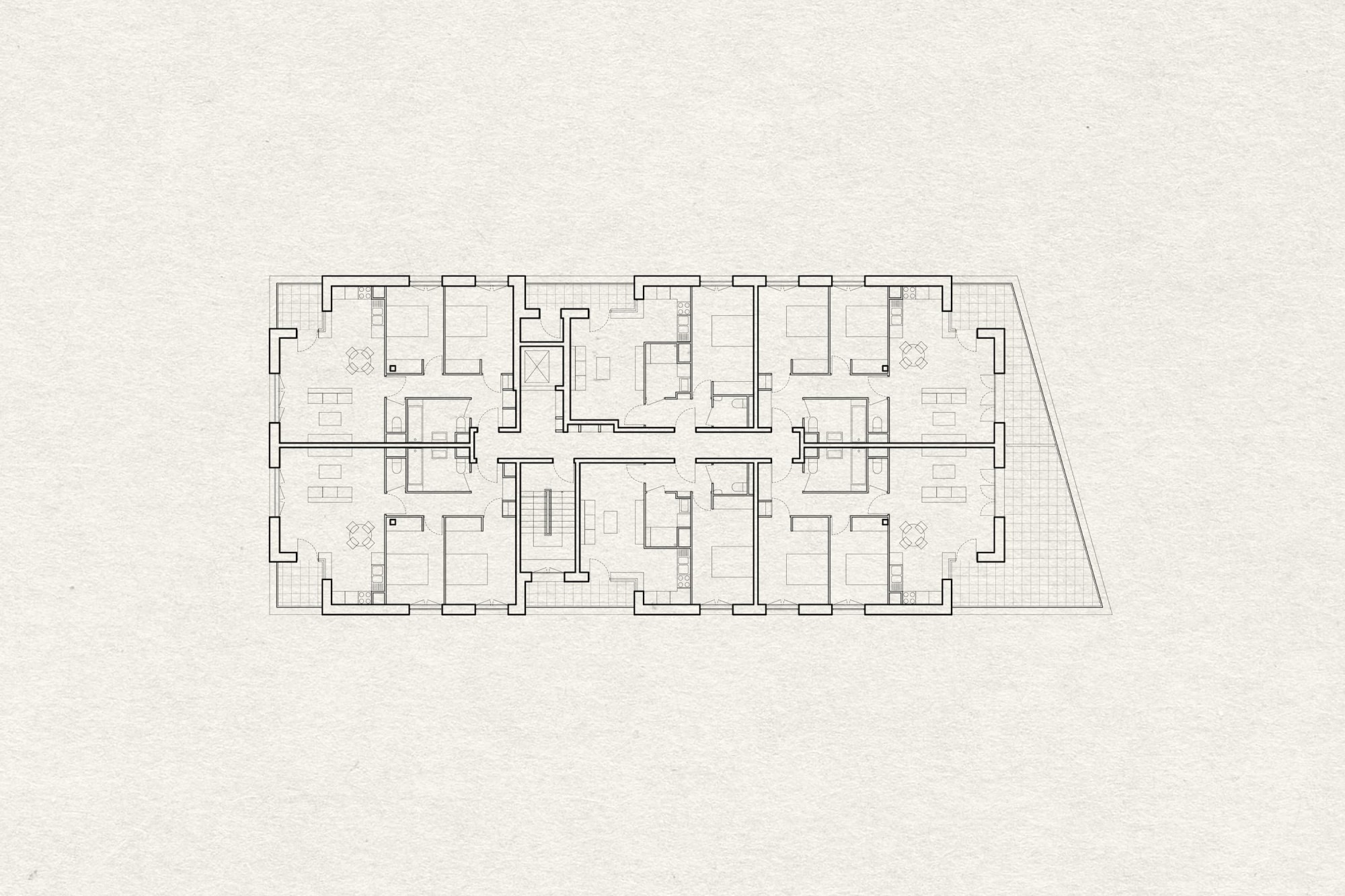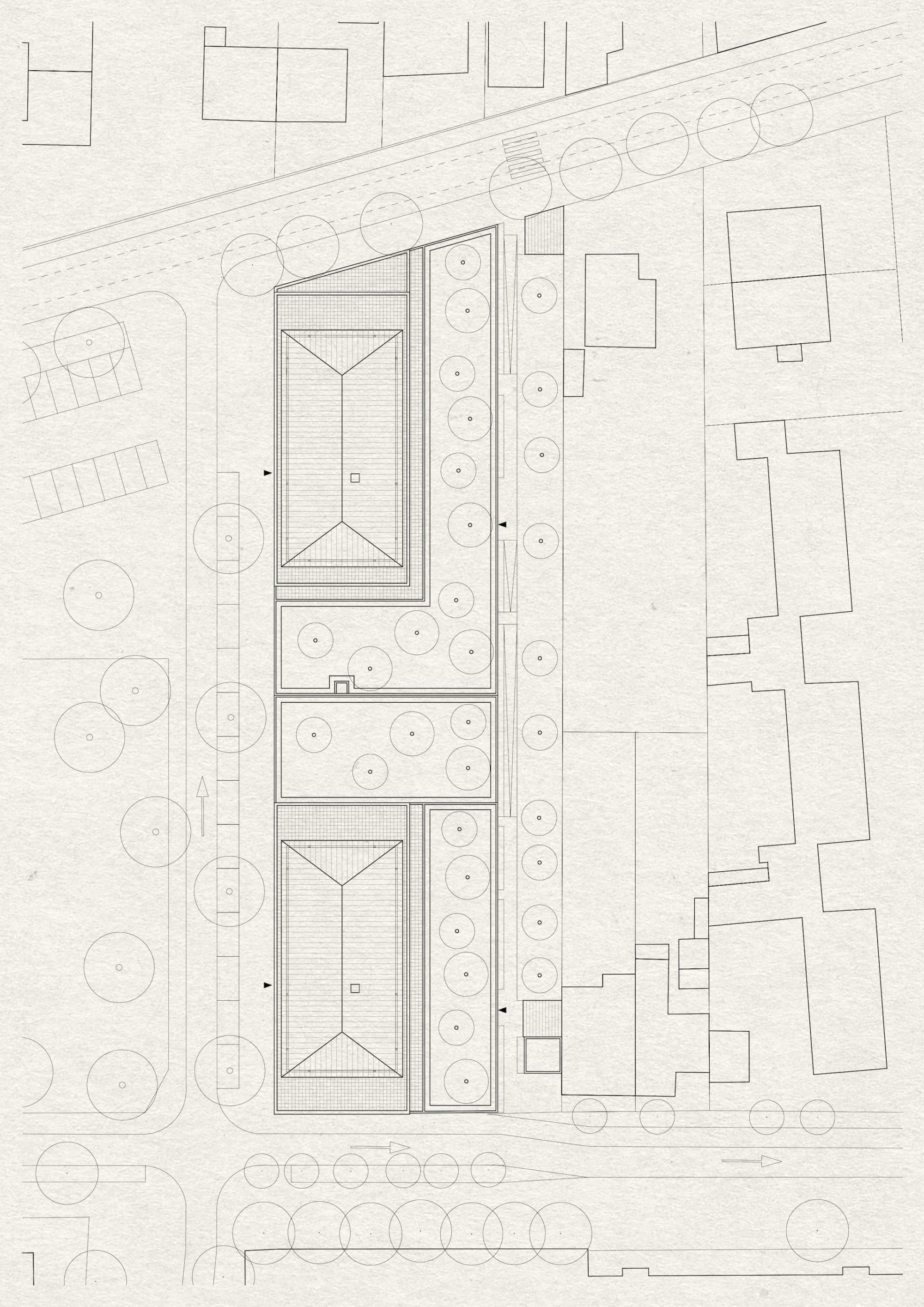 La particularité de ce projet tient dans la spécificité de la parcelle qui combine un linéaire de façade très important, environ 100m, orienté au Nord, sur un espace public majeur en devenir, à des franges fragmentées essentiellement composés de maisons à R+1. Notre travail a donc pour ambition de composer un front urbain franc et affirmé tout en ménageant les habitations individuelles existantes afin qu’elles conservent leurs qualités et l’ensoleillement actuels.