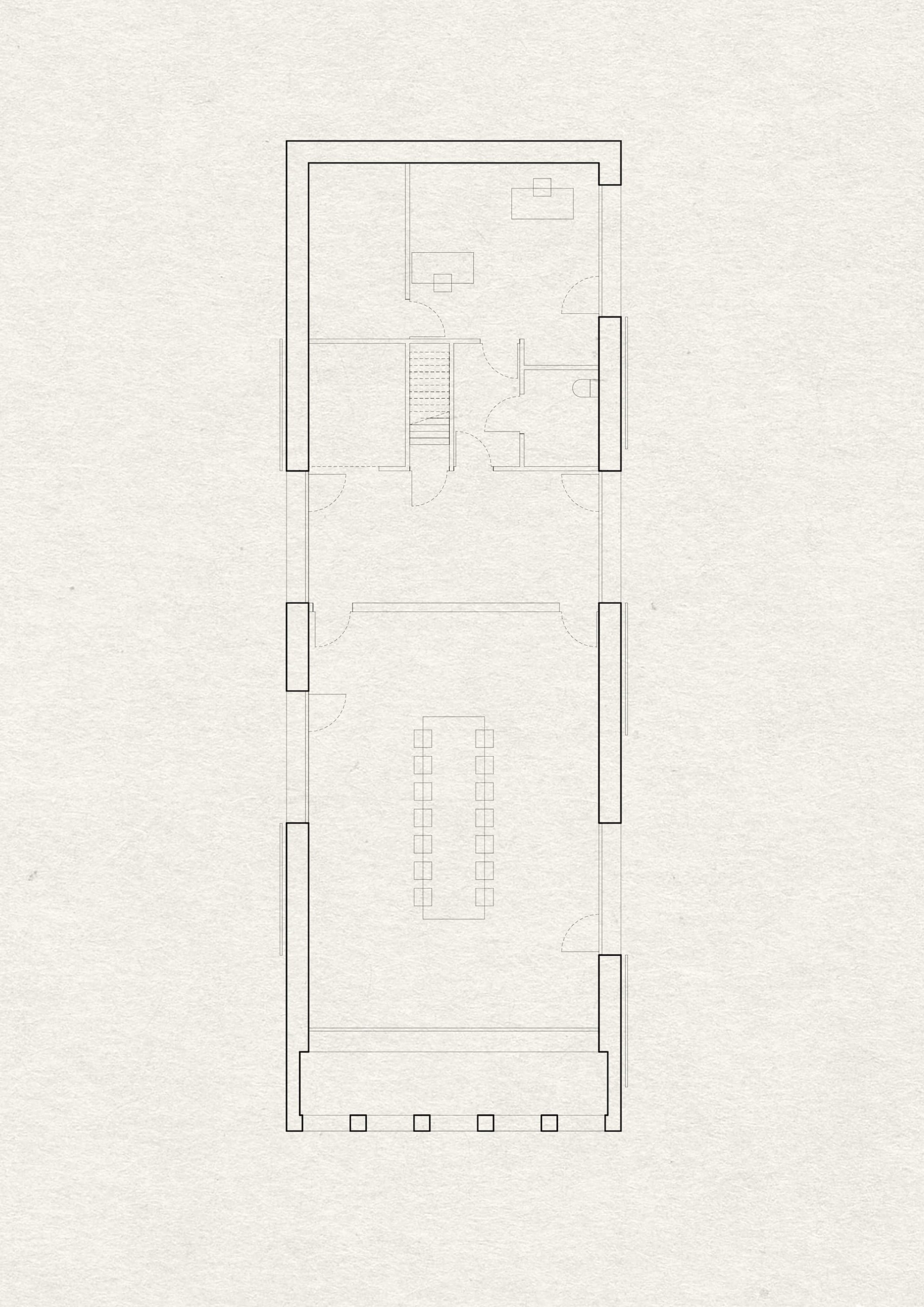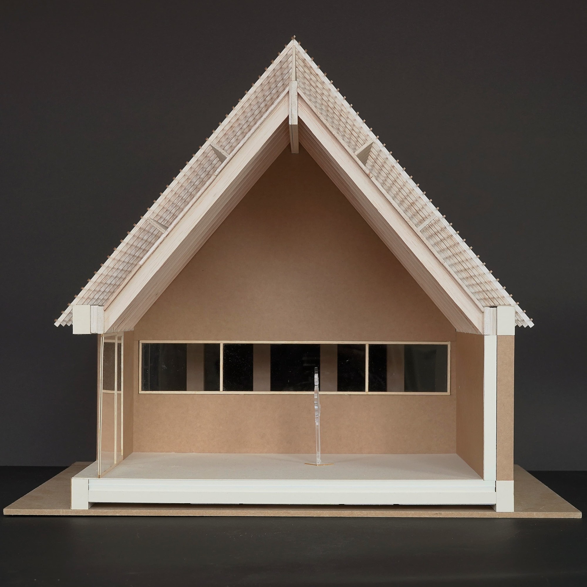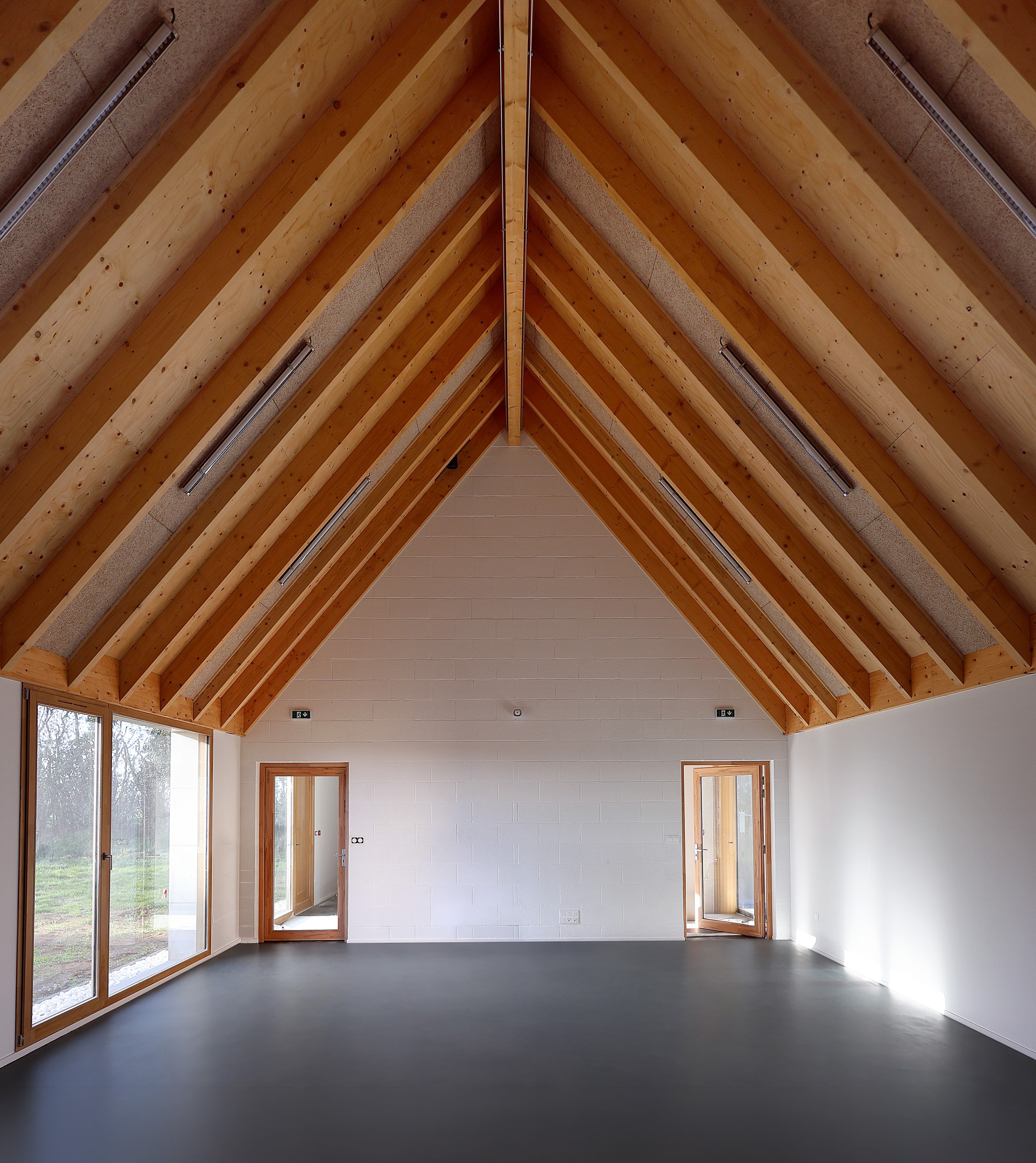 Le pignon Est, orienté vers la route, abrite une loggia qui sert d’abribus pour le ramassage scolaire. A l’intérieur, la salle du conseil bénéficie d’un soin particulier. La charpente, dont les arbalétriers sont laissés apparents, libère une hauteur généreuse qui confère à cette pièce la noblesse de sa fonction.-