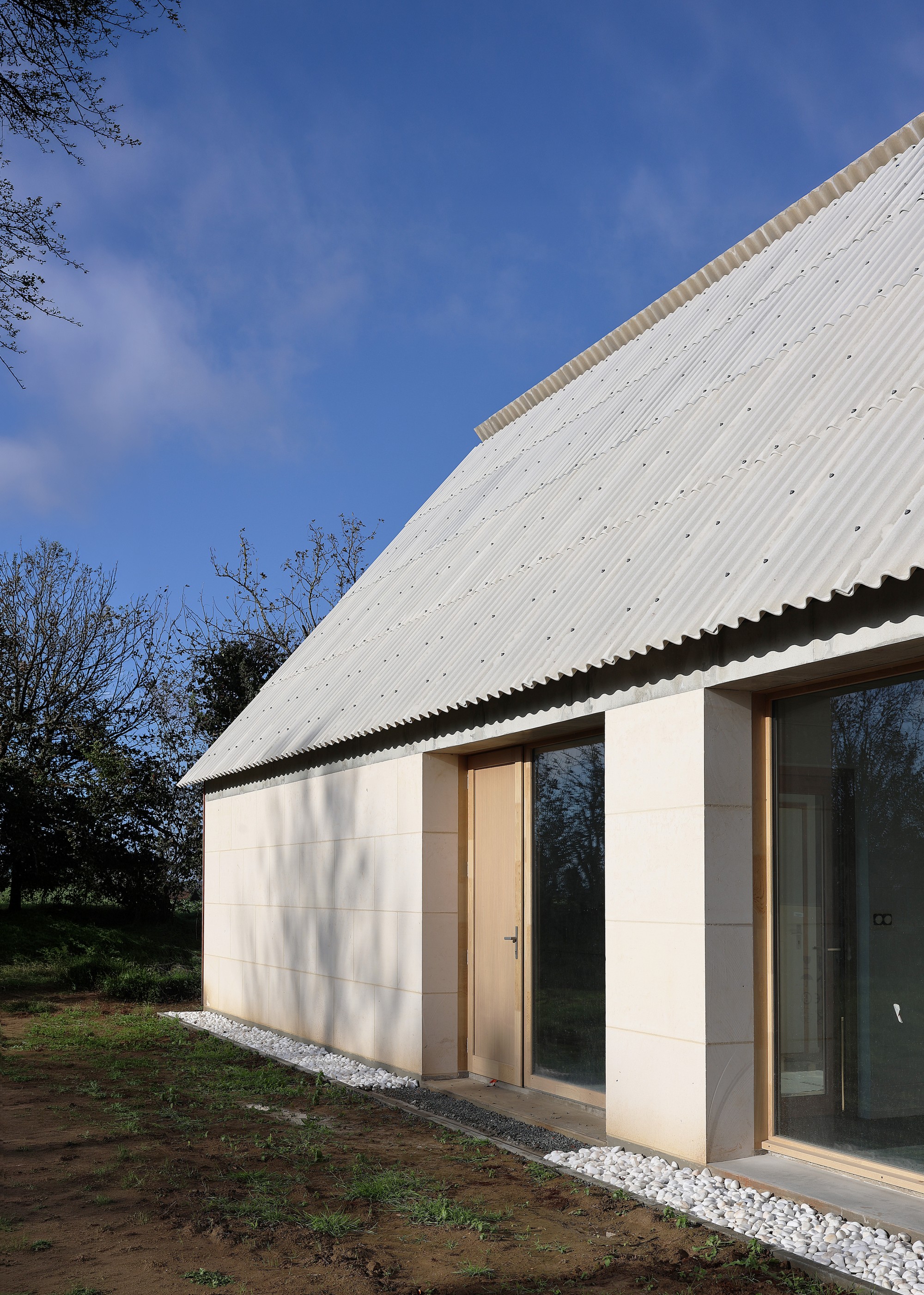 L’architecture de la mairie reprend les codes des bâtiments agricoles ruraux : une longère traversante, en pierre massive, dont la charpente bois est recouverte de tuiles en fibro-ciment. Les menuiseries présentent des proportions qui s’apparentent aux ouvertures des granges vernaculaires et sont occultées par de larges portes coulissantes en bois.