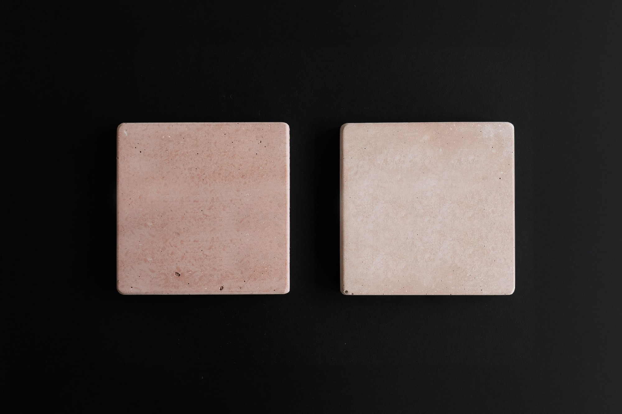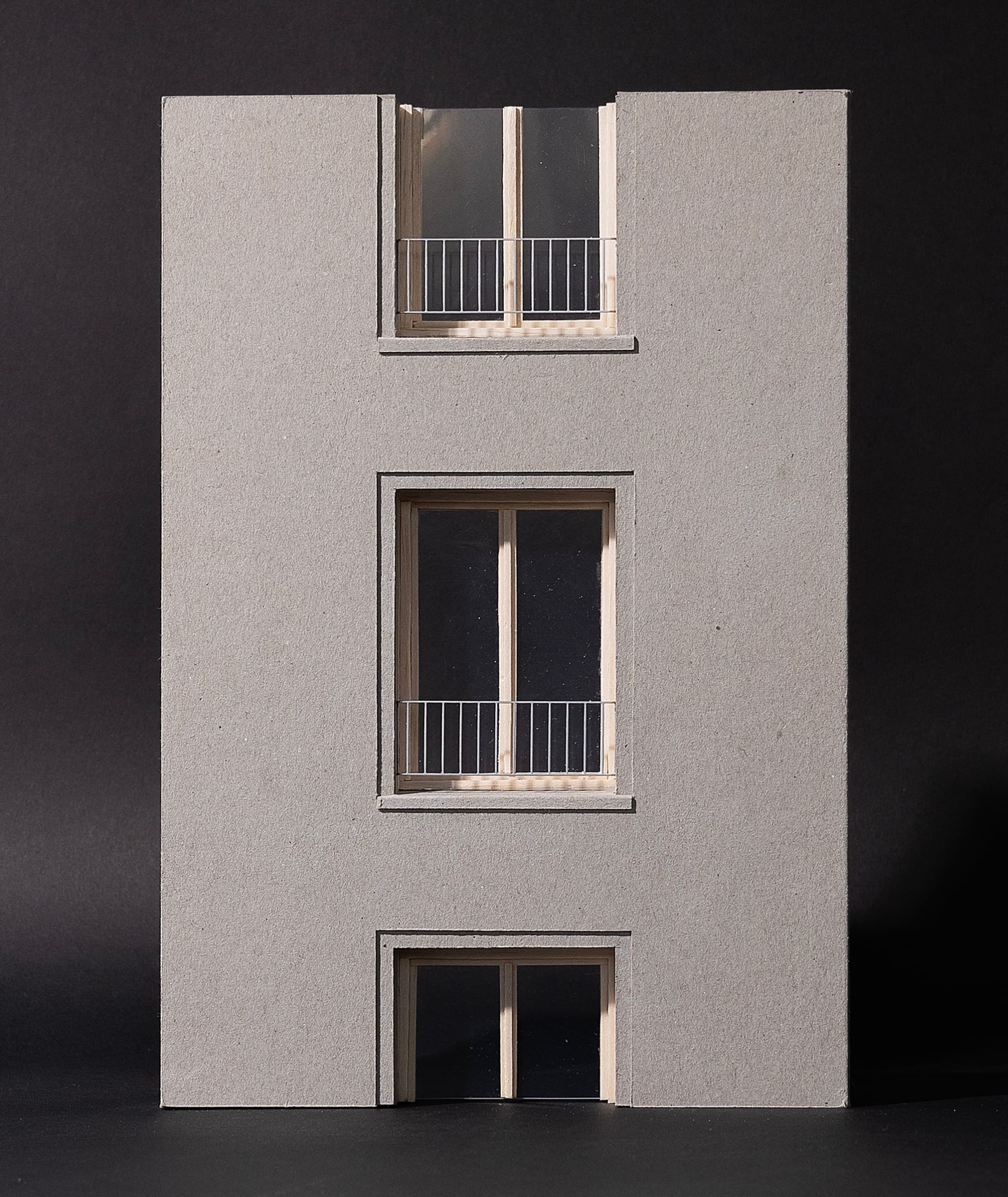 Les façades sont réalisées en béton teinté dans la masse, selon une trame régulière de fenêtres à double vantail en bois, agrémentées de garde-corps en serrurerie fine. Un léger tamponnage vient marquer l’encadrement de ces fenêtres.