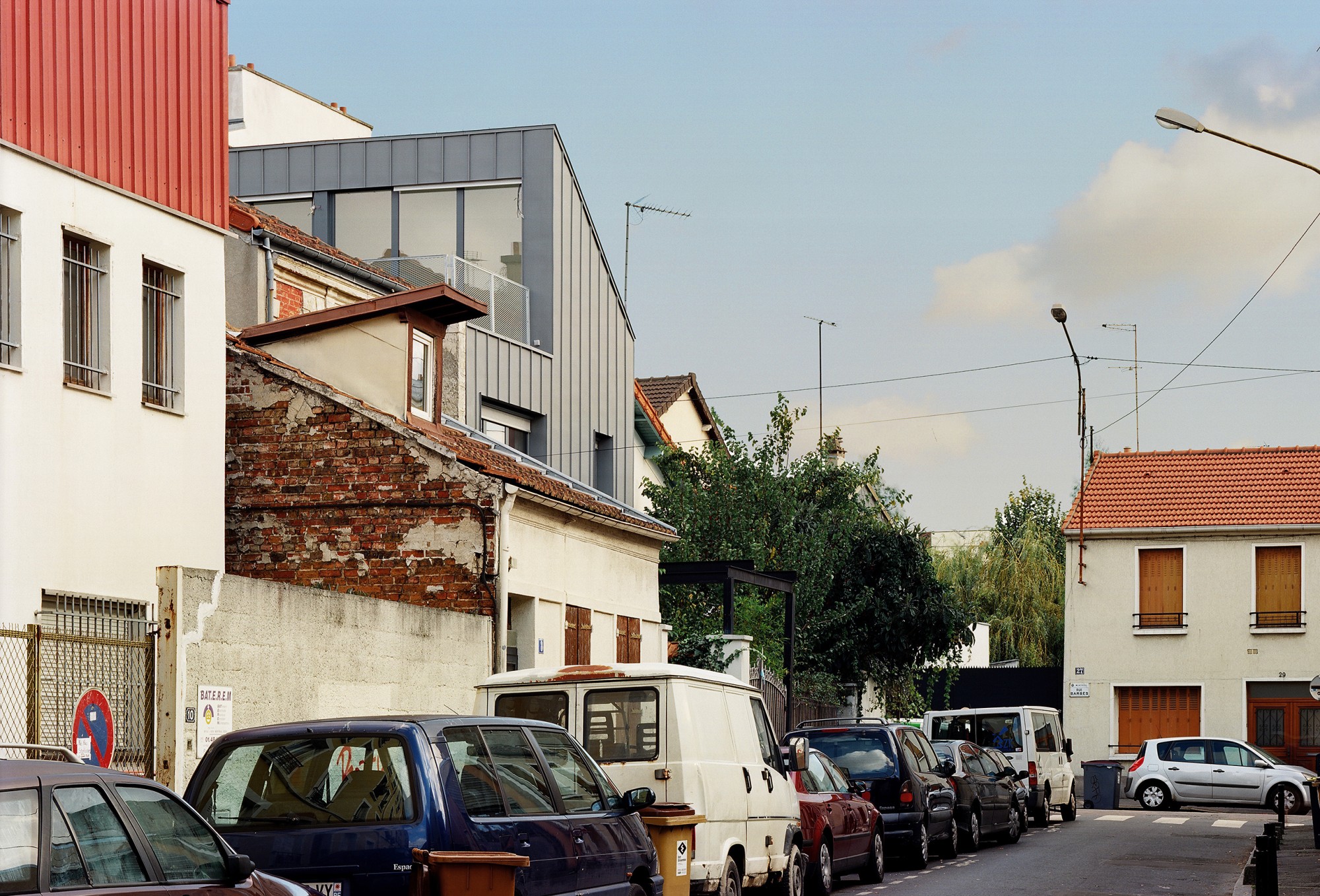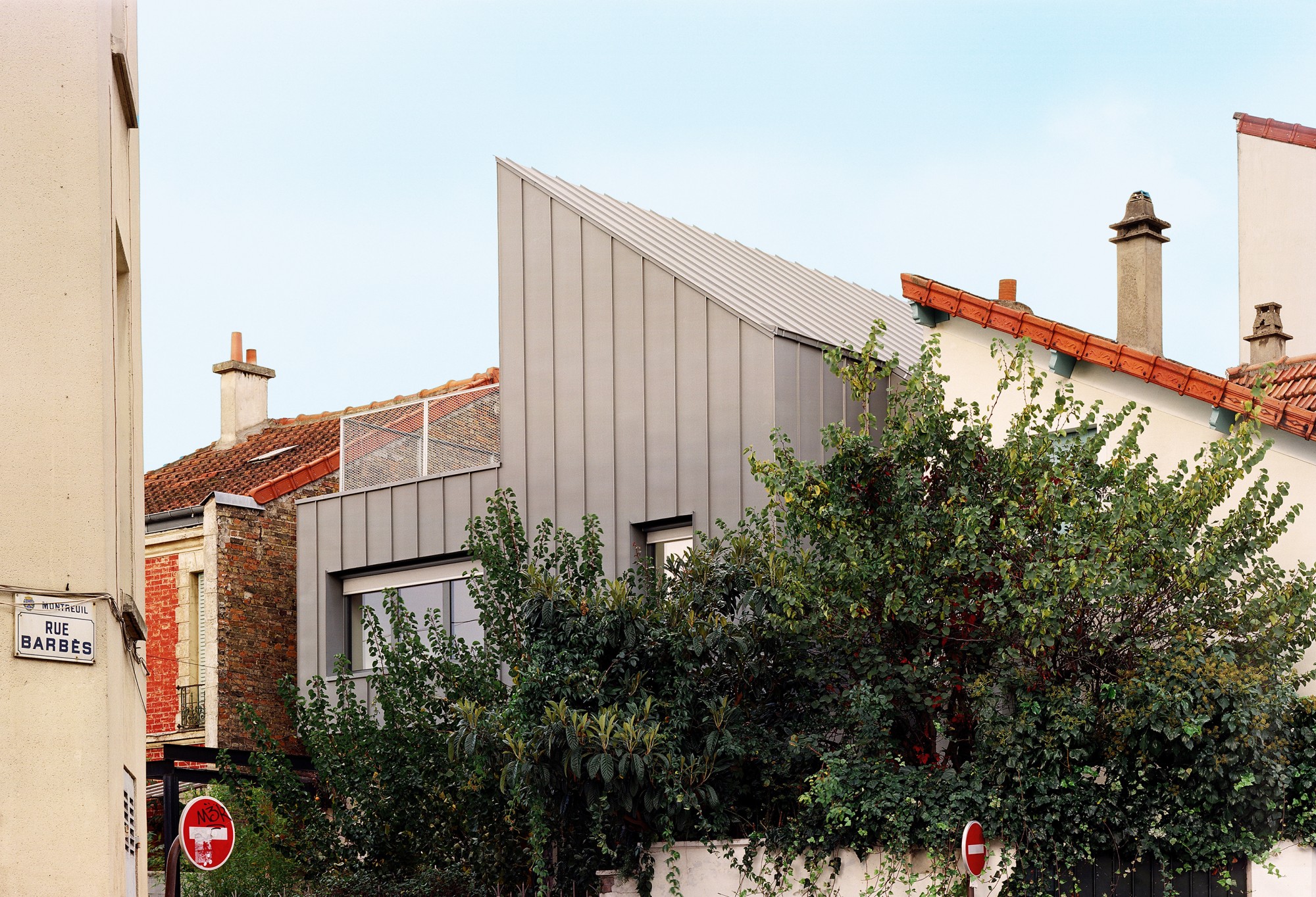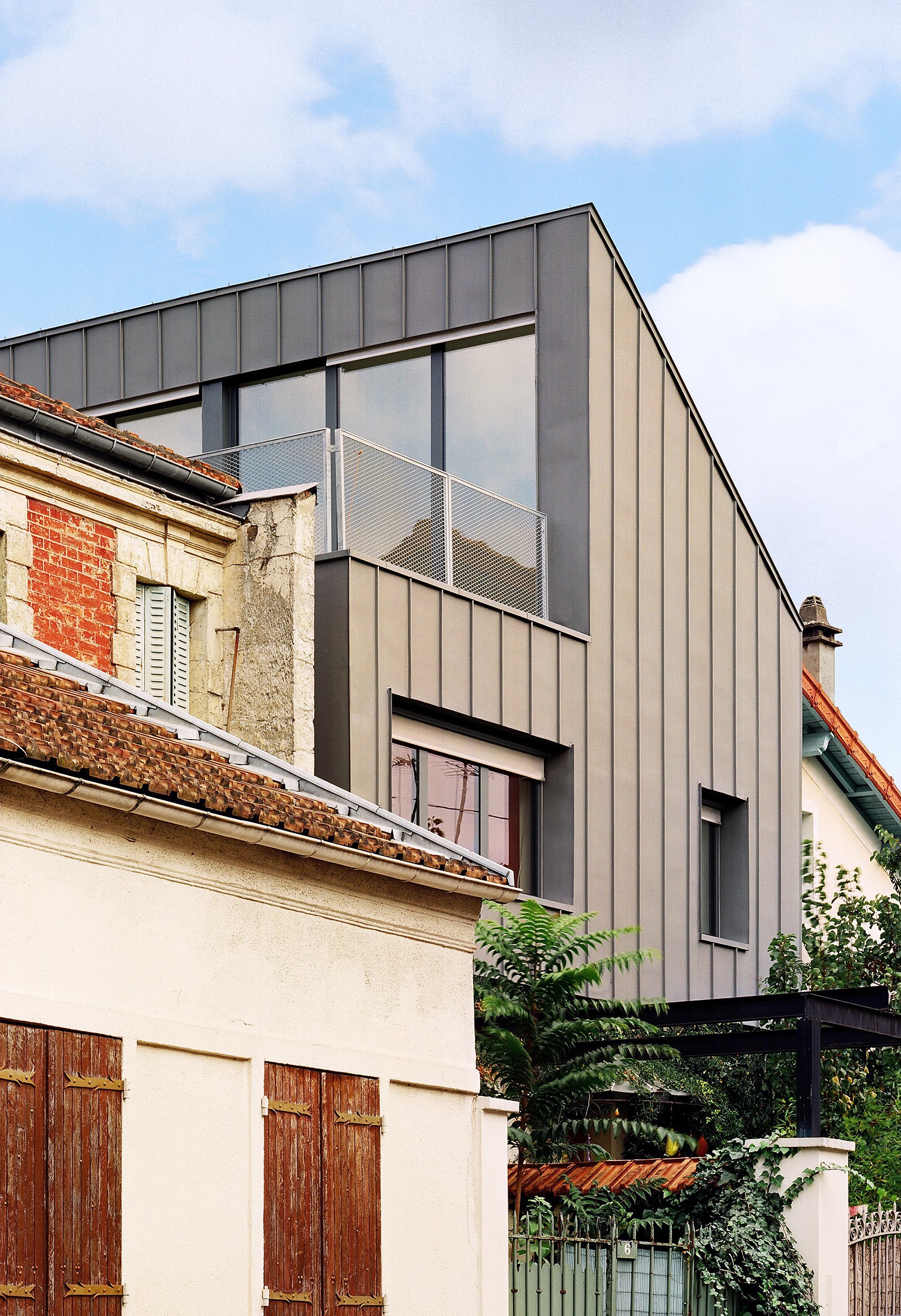 Les clients, un couple et leur petite fille, ont fait l’acquisition de cette maison avec l’idée de l’agrandir au moyen d’une surélévation. Leur souhait était de réaliser trois chambres à l’étage et de disposer d’une toiture terrasse accessible via un édicule. Or, la ville de Montreuil est caractérisée par une forte mixité du tissu urbain, composé aussi bien de pavillonnaire que d’anciennes activités industrielles. Ces dernières demeurent encore très visibles et façonnent un jeu de toitures hétéroclites qui constitue l’inspiration de ce projet. Ainsi, la surélévation est traitée comme une toiture en zinc posée sur la maison existante en enduit blanc. Le volume ajouté, en murs ossature bois préfabriqué, reprend le principe des sheds industriels.