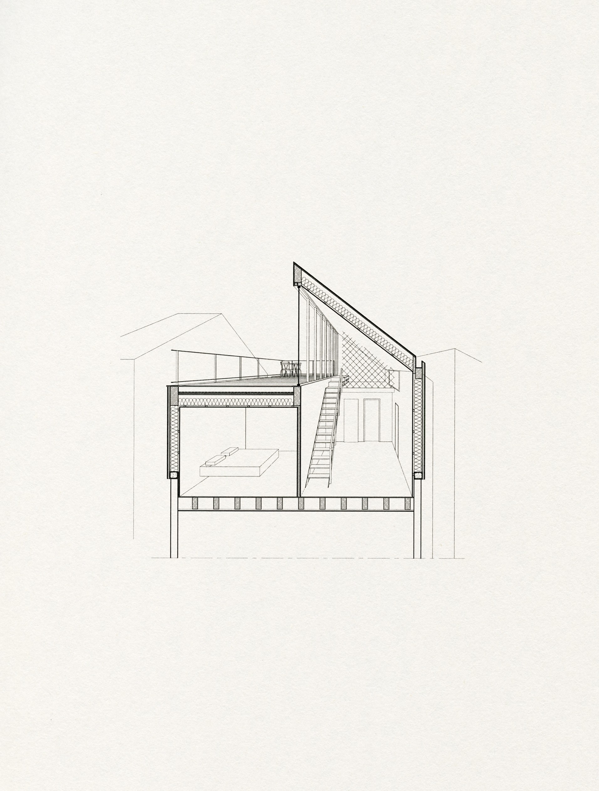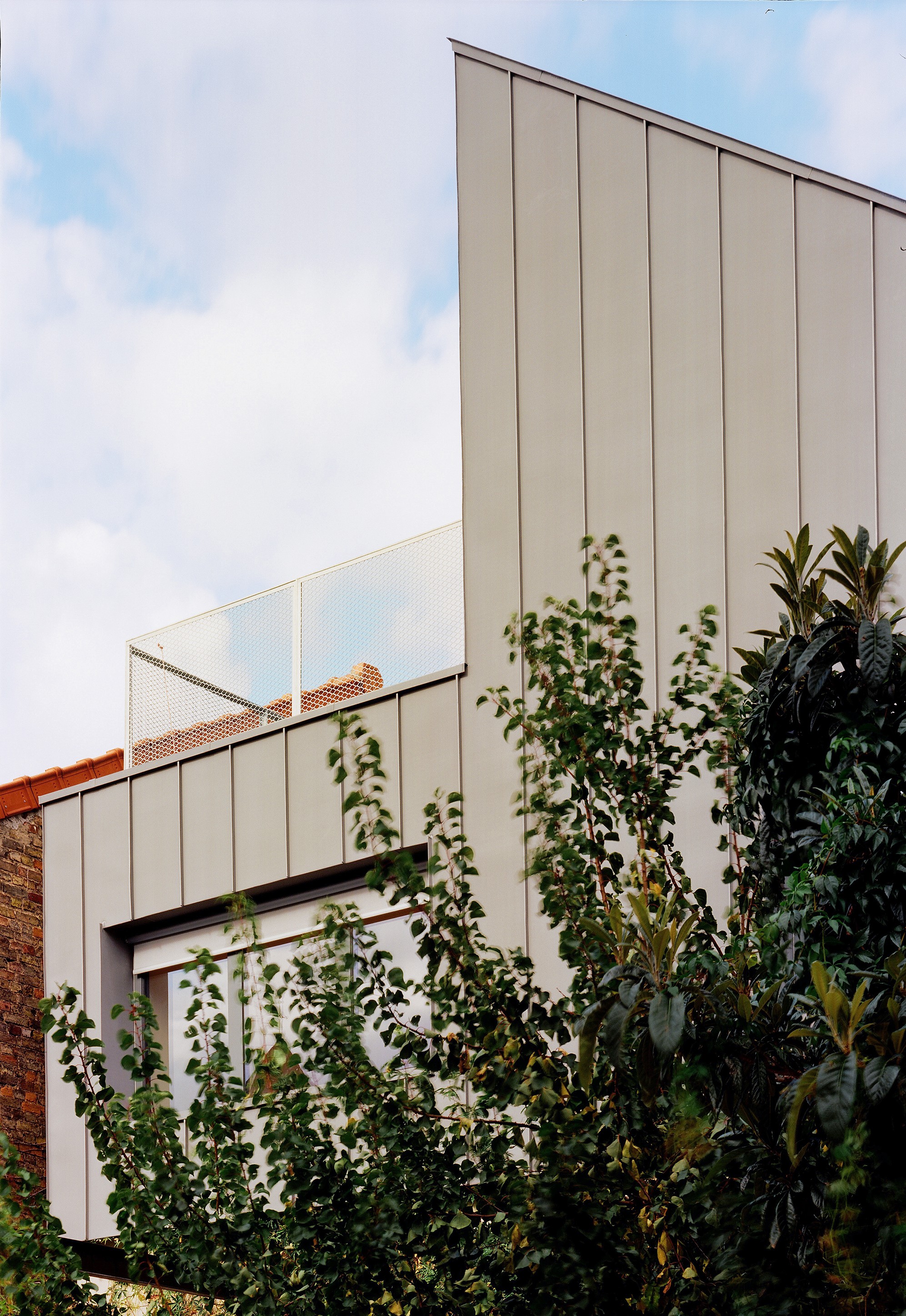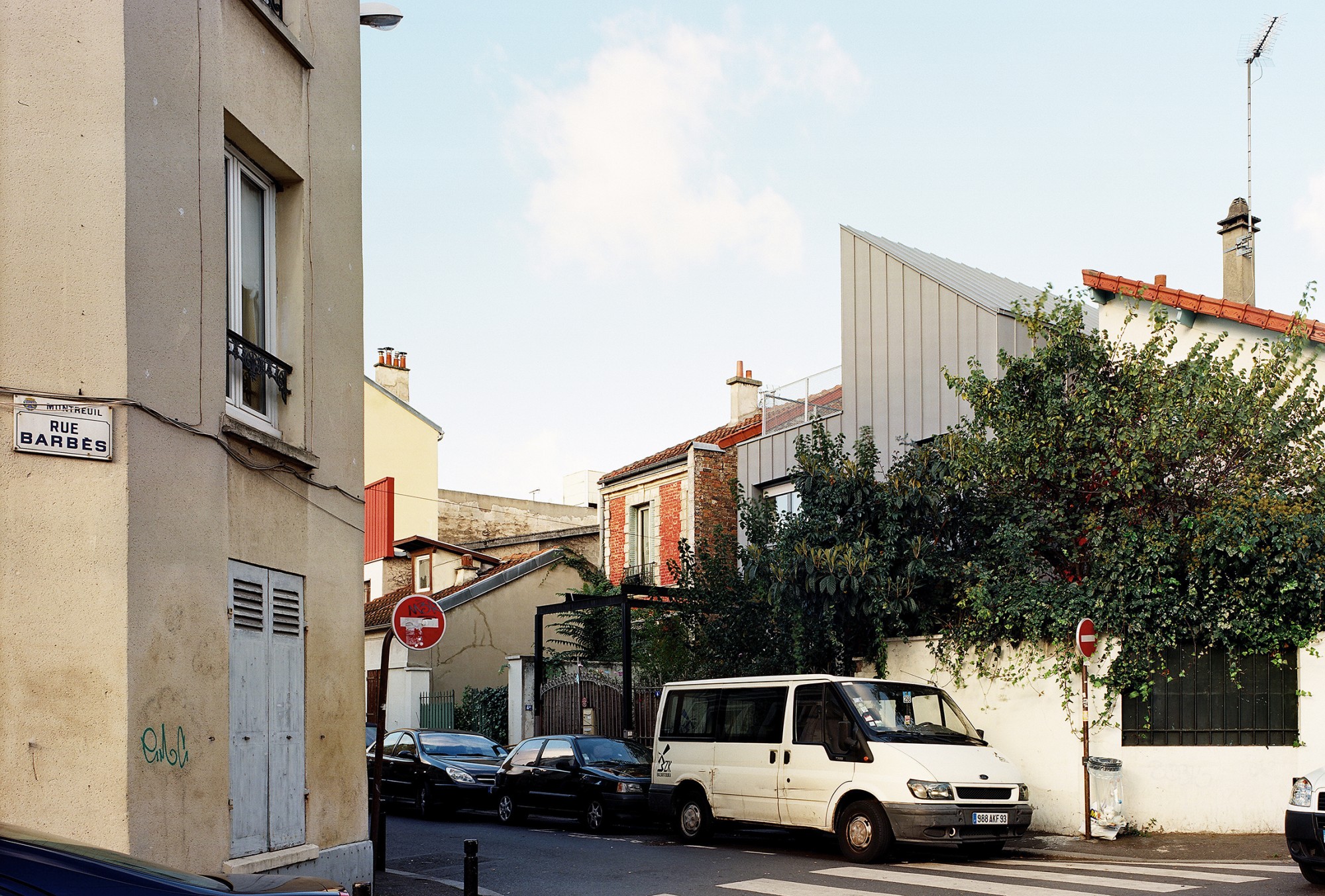 Les clients, un couple et leur petite fille, ont fait l’acquisition de cette maison avec l’idée de l’agrandir au moyen d’une surélévation. Leur souhait était de réaliser trois chambres à l’étage et de disposer d’une toiture terrasse accessible via un édicule. Or, la ville de Montreuil est caractérisée par une forte mixité du tissu urbain, composé aussi bien de pavillonnaire que d’anciennes activités industrielles. Ces dernières demeurent encore très visibles et façonnent un jeu de toitures hétéroclites qui constitue l’inspiration de ce projet. Ainsi, la surélévation est traitée comme une toiture en zinc posée sur la maison existante en enduit blanc. Le volume ajouté, en murs ossature bois préfabriqué, reprend le principe des sheds industriels.