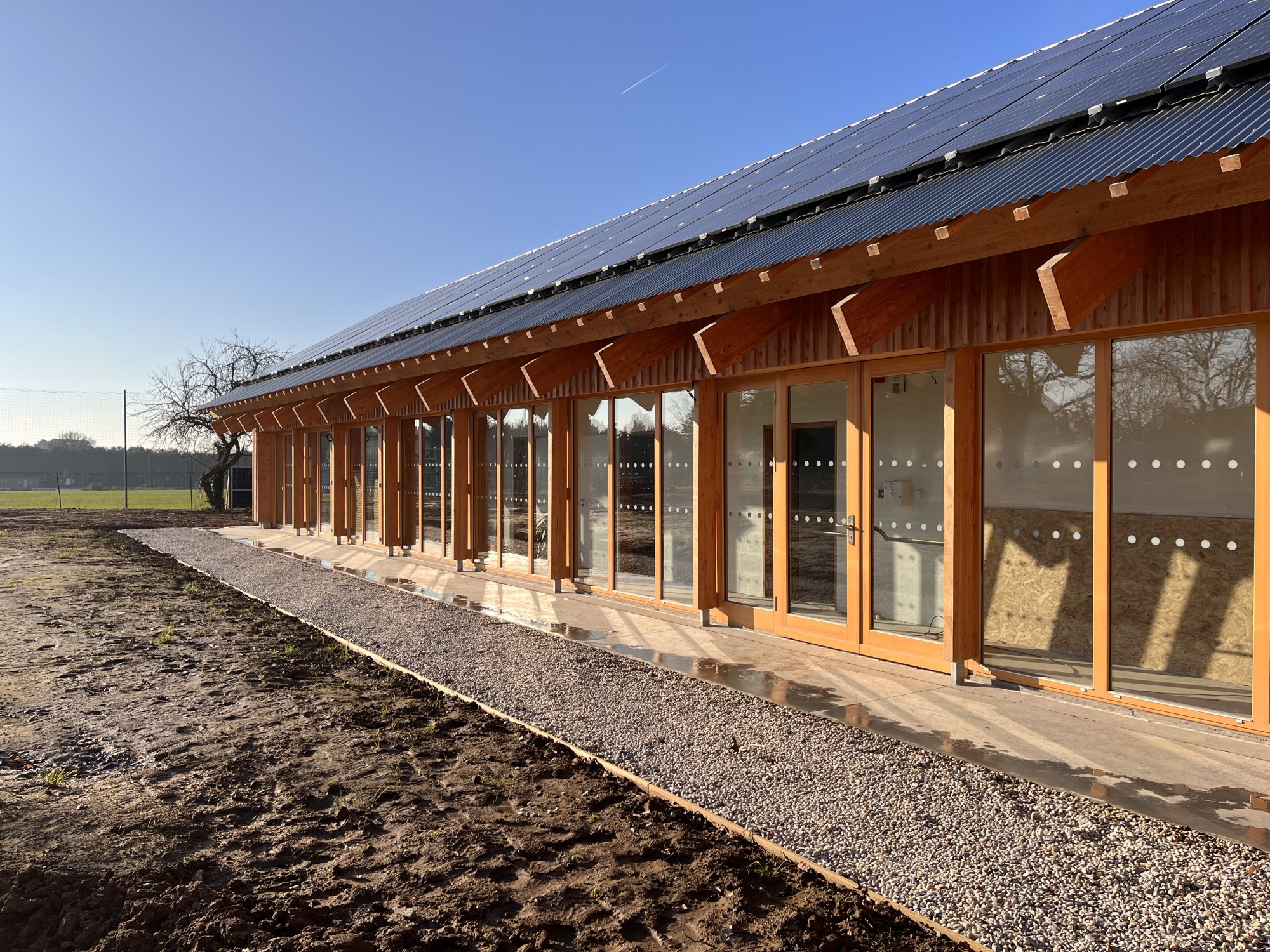 La nouvel équipement, construit en ossature bois et isolation paille, est coiffée d’une couverture en bac acier ondulé recouverte de panneaux photovoltaïques sur les pans Ouest. Sa façade Est, entièrement vitrée, s’ouvre complètement sur la halle couverte par le biais de portes accordéons en bois. Ce dispositif permet ainsi de doubler la surface de la salle principale lors des manifestations estivales.-