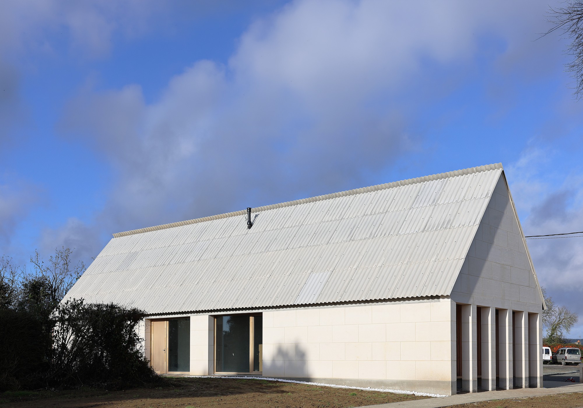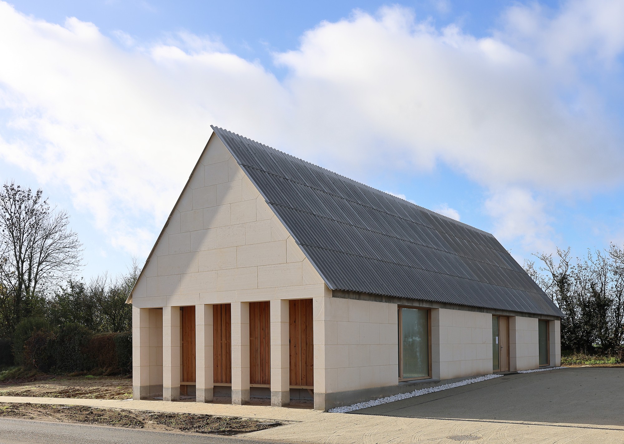 L’architecture de la mairie reprend les codes des bâtiments agricoles ruraux : une longère traversante, en pierre massive, dont la charpente bois est recouverte de tuiles en fibro-ciment. Les menuiseries présentent des proportions qui s’apparentent aux ouvertures des granges vernaculaires et sont occultées par de larges portes coulissantes en bois.