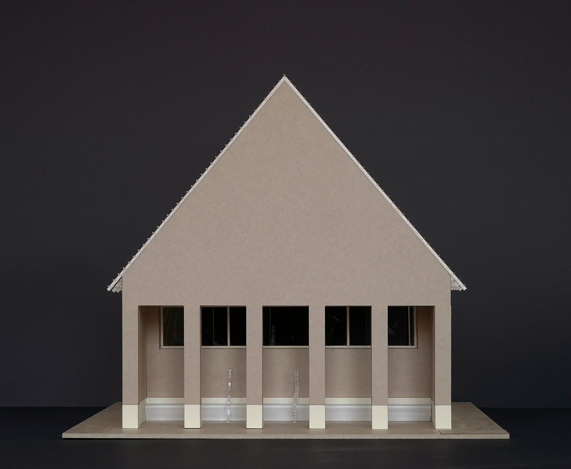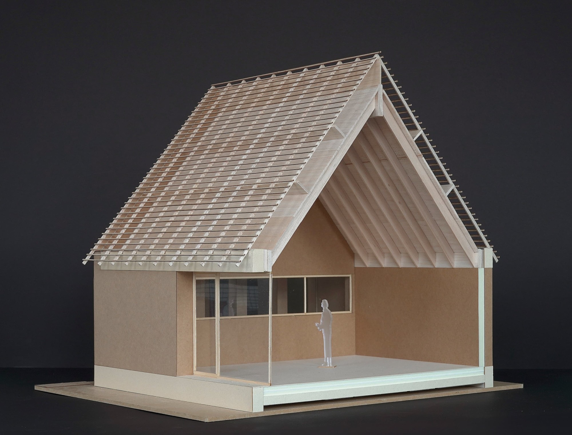 Le pignon Est, orienté vers la route, abrite une loggia qui sert d’abribus pour le ramassage scolaire. A l’intérieur, la salle du conseil bénéficie d’un soin particulier. La charpente, dont les arbalétriers sont laissés apparents, libère une hauteur généreuse qui confère à cette pièce la noblesse de sa fonction.-