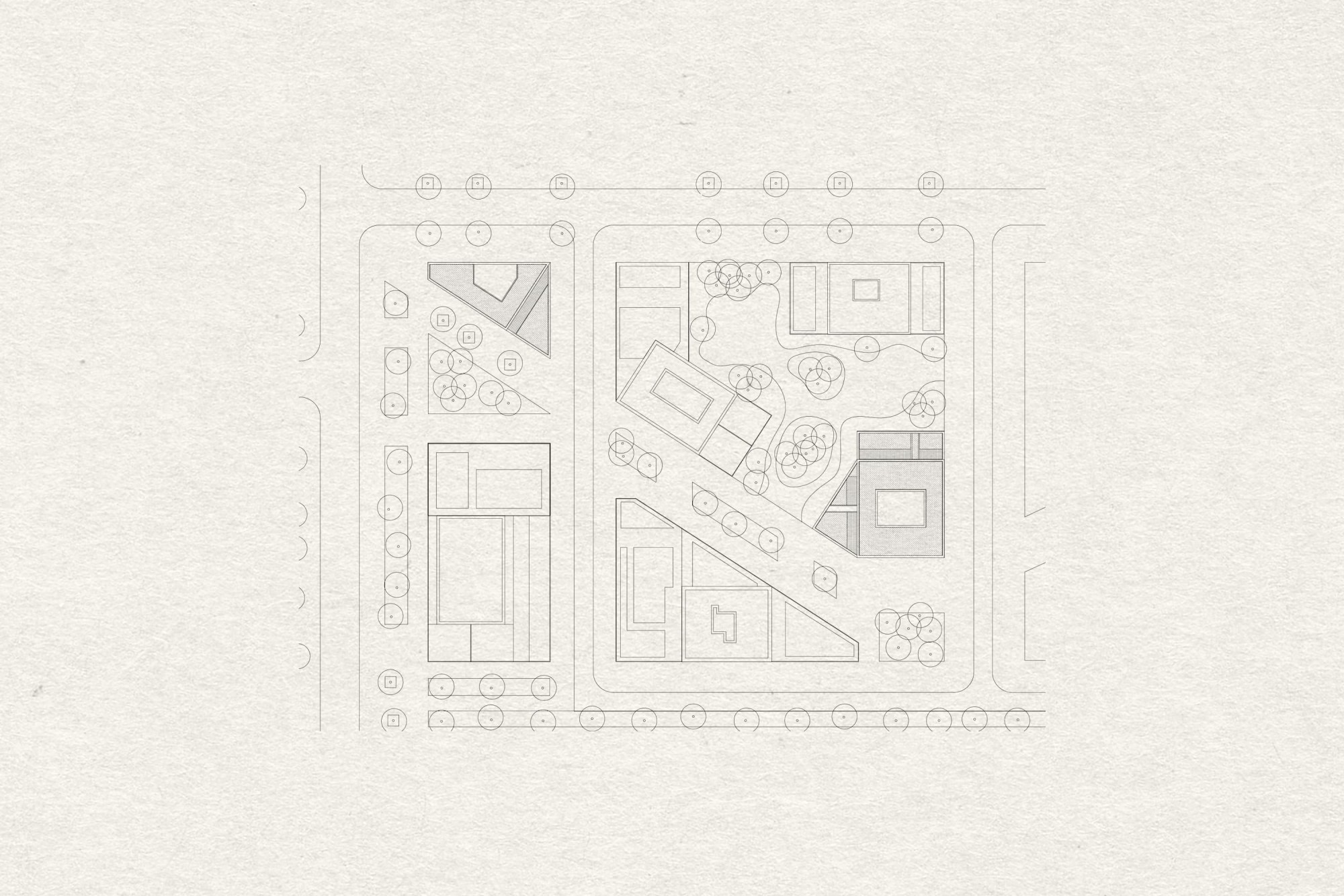 Actuellement, la parcelle est occupée par un centre commercial fermé sur l’extérieur et orienté vers des cours intérieures. Le projet urbain propose de renverser cette logique en réintroduisant des bâtiments de logements accompagnés de rez-de-chaussée commerciaux largement ouverts sur l’espace public, participant ainsi à la revitalisation urbaine et à l’animation des rues environnantes.